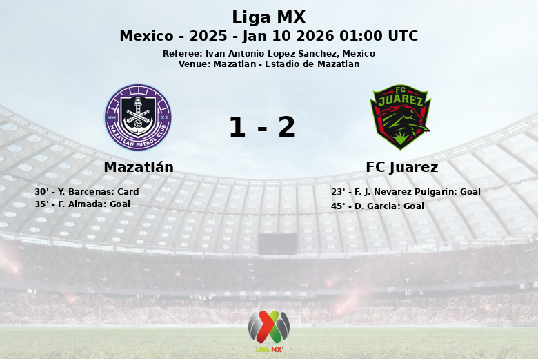 FC Juárez se adelantó en el marcador en el minuto 23 gracias a un gol de F. J. Nevarez Pulgarin, asistido por Madson. Sin embargo, Mazatlán respondió con un gol de F. Almada en el minuto 35, tras una asistencia de I. Gonzalez, equilibrando las acciones. El partido se mantuvo intenso y disputado, con una amarilla para Y. Barcenas del Mazatlán en el minuto 30. Justo antes del descanso, D. Garcia, con asistencia de Puma, volvió a adelantar a FC Juárez al minuto 45.