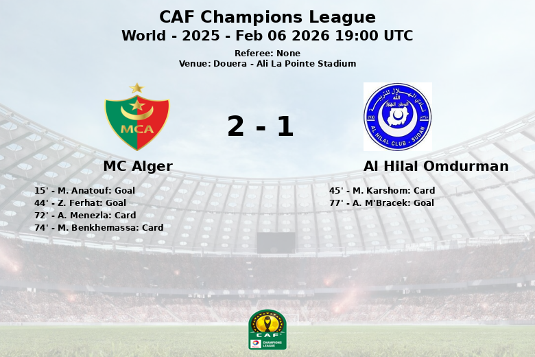 Douera, 6 de febrero de 2026 – El MC Alger logró una importante victoria en casa ante el Al Hilal Omdurman en un encuentro correspondiente a la CAF Champions League, disputado en el Ali La Pointe Stadium. El partido, correspondiente a la quinta jornada de la temporada regular, se caracterizó por un juego táctico y físico, con ambos equipos buscando imponer su estilo.