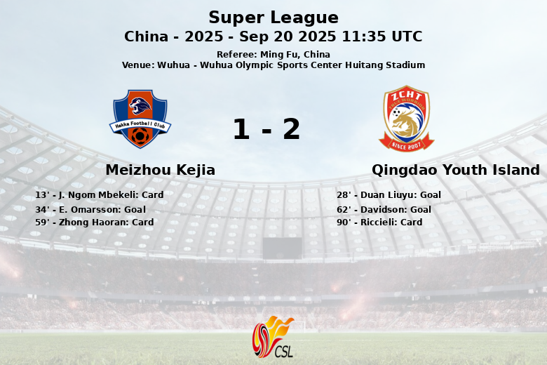 El Qingdao Youth Island abrió el marcador al minuto 28 con un gol de Duan Liuyu. Sin embargo, Meizhou Kejia respondió al minuto 34 con un tanto de E. Omarsson, igualando el encuentro. El segundo tiempo vio al Qingdao Youth Island retomar la ventaja al minuto 62 gracias a Davidson.
