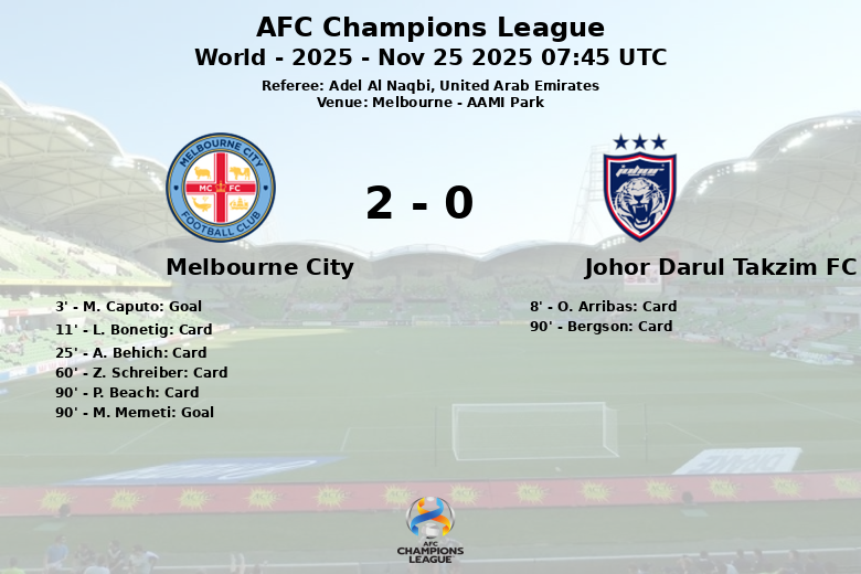El partido se caracterizó por un juego físico, evidenciado por las seis tarjetas amarillas mostradas por el árbitro Adel Al Naqbi, cuatro para Melbourne City y dos para Johor Darul Takzim FC. El conjunto malayo generó mayor peligro en ataque, con 22 tiros totales (10 a puerta), frente a los 11 de Melbourne City (3 a puerta). No obstante, la defensa local se mantuvo sólida hasta que, en el tiempo de descuento, M. Memeti sentenció el partido con un gol al minuto 90, asistido por B. Baker, sellando una valiosa victoria para el Melbourne City. La victoria deja al equipo australiano con buenas perspectivas en la competición continental.