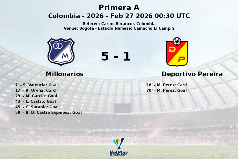 En un partido disputado en el Estadio Nemesio Camacho El Campín de Bogotá, Millonarios se impuso con autoridad al Deportivo Pereira, demostrando superioridad en posesión y efectividad frente al arco. Desde el inicio, el equipo local tomó el control del juego, abriendo el marcador al minuto 7 con un gol de S. Valencia. El dominio de Millonarios se tradujo en una lluvia de goles, con M. García anotando al minuto 29, seguido por L. Castro al minuto 43 y C. Sarabia al minuto 45, cerrando la primera mitad con una ventaja abrumadora.