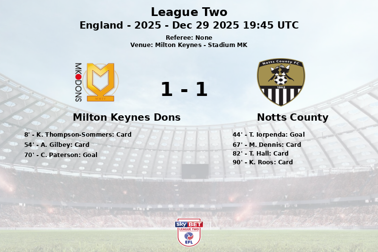 Milton Keynes, Inglaterra – En un encuentro disputado en el Stadium MK, el Milton Keynes Dons y el Notts County empataron a un gol en un partido intenso y lleno de tarjetas. El Notts County se adelantó en el marcador al filo del descanso, en el minuto 44, gracias a un gol de T. Iorpenda, asistido por N. Tsaroulla.