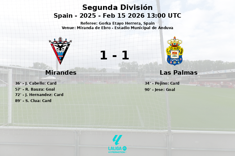 El partido se calentó en la primera mitad con tarjetas amarillas para Pejino (Las Palmas) y J. Cabello (Mirandés). La segunda mitad vio al Mirandés tomar la delantera gracias a un gol de R. Bauza en el minuto 57, con asistencia de A. Mari. Las Palmas, con una mayor vocación ofensiva (15 tiros frente a 5 del Mirandés), luchó por encontrar el empate.