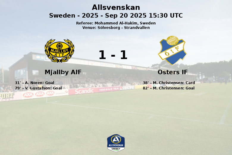 El encuentro, arbitrado por Mohammed Al-Hakim, finalizó con un reparto de puntos que deja a ambos equipos con la sensación de haber podido obtener algo más. Mjallby AIF tuvo mayor control del juego y más llegadas al área rival (9 corners contra 6 de Osters IF), pero la efectividad de Osters IF fue clave para llevarse un punto de Sölvesborg.