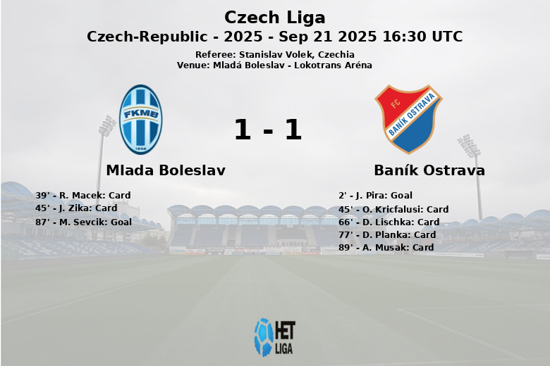 Mladá Boleslav, República Checa – En un encuentro disputado en la Lokotrans Aréna, el partido entre Mlada Boleslav y Baník Ostrava culminó con un empate 1-1. Baník Ostrava se adelantó temprano en el marcador con un gol de J. Pira en el minuto 2, gracias a una asistencia de D. Planka. A pesar de la tempranera ventaja, el partido se caracterizó por una alta intensidad y varias tarjetas amarillas. Mlada Boleslav recibió dos amonestaciones en el primer tiempo, mientras que Baník Ostrava vio una tarjeta antes del descanso y otras tres en la segunda mitad. El Mlada Boleslav dominó la posesión del balón con un 57%, generando 20 tiros, aunque solo 5 fueron a puerta. El Baník Ostrava, con un 43% de posesión, logró 12 tiros, también con 5 al arco. El drama llegó en los últimos minutos cuando M. Sevcik del Mlada Boleslav convirtió un penal en el minuto 87, sellando el empate definitivo. Ambos equipos mostraron una actitud aguerrida, reflejada en el alto número de faltas cometidas y tarjetas mostradas.