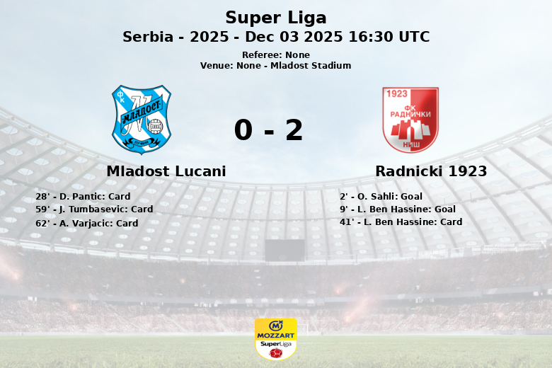 Kragujevac, Serbia – En un encuentro disputado en el Mladost Stadium, el Radnicki 1923 se impuso al Mladost Lucani con una temprana demostración de poderío ofensivo. O. Sahli abrió el marcador al minuto 2, asistido por K. Bevis, seguido rápidamente por L. Ben Hassine al minuto 9, también con asistencia de Bevis, consolidando una ventaja temprana.