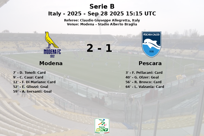 En un encuentro disputado en el Stadio Alberto Braglia, el Modena logró remontar un marcador adverso para imponerse al Pescara. El partido, correspondiente a la quinta jornada de la Serie B, estuvo marcado por un alto número de amonestaciones, con tres tarjetas amarillas para cada equipo. El Pescara se adelantó en el minuto 40 gracias a un gol de G. Olzer, asistido por T. Corazza. Sin embargo, el Modena reaccionó en la segunda mitad. E. Gliozzi igualó el encuentro en el minuto 52 mediante un penalti. Tan solo siete minutos después, A. Sersanti, con asistencia de F. Di Mariano, selló la victoria para el Modena. A pesar de mantener una ligera superioridad en la posesión del balón (52%), el Pescara no pudo capitalizar sus oportunidades, realizando únicamente 5 tiros, de los cuales solo 2 fueron a puerta. El Modena, por su parte, generó 15 tiros, aunque solo 3 encontraron la portería rival. El partido también se caracterizó por un alto número de faltas cometidas por ambos equipos, 14 para cada uno.