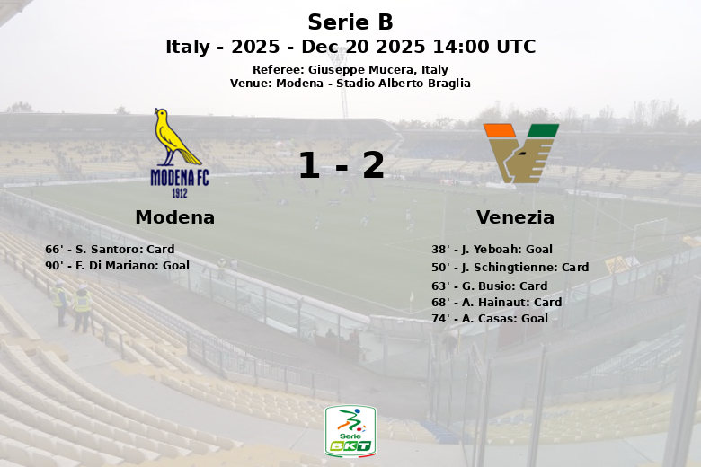 En la segunda mitad, el juego se tornó más disputado y físico. Se registraron varias amonestaciones, con tarjetas amarillas para J. Schingtienne, G. Busio y A. Hainaut por parte del Venezia, y para S. Santoro por el Modena. Venezia amplió su ventaja en el minuto 74 con un gol de A. Casas, asistido por R. Haps.