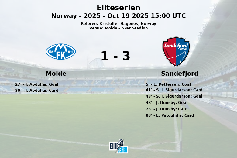 El Sandefjord golpeó primero al minuto 5 con un gol de E. Pettersen, asistido por L. Mettler. Sin embargo, el Molde reaccionó y logró empatar el marcador al minuto 27 gracias a J. Abdullai, quien recibió una asistencia de H. Stenevik. Justo antes del descanso, al minuto 43, S. I. Sigurdarson devolvió la ventaja al Sandefjord con un gol asistido por J. Dunsby. En la segunda mitad, J. Dunsby amplió la ventaja para el Sandefjord al minuto 48 con un gol asistido por C. Cheng, estableciendo el 3 a 1 definitivo.