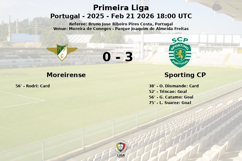 La primera mitad transcurrió sin goles, aunque la intensidad se hizo presente con una tarjeta amarilla para O. Diomande del Sporting CP al minuto 38. En la segunda mitad, el Sporting CP rompió el empate con un gol de Trincao al minuto 52, tras una asistencia de M. Araujo. Poco después, al minuto 56, G. Catamo aumentó la ventaja con un gol, asistido por Trincao. La contundencia del Sporting CP se materializó con un gol de L. Suarez al minuto 75, sellando una victoria que refleja su dominio en el campo. Por su parte, el Moreirense, con un 37% de posesión, logró realizar 6 disparos, de los cuales solo 2 fueron a puerta, y recibió una tarjeta amarilla para Rodri al minuto 56. El árbitro, Bruno Jose Ribeiro Pires Costa, dirigió el encuentro sin mayores incidentes.