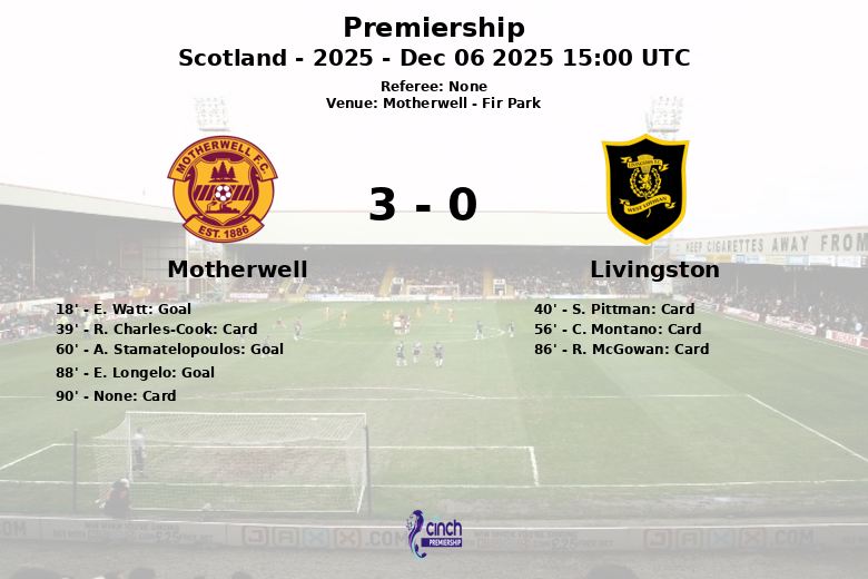 E. Watt abrió el marcador en el minuto 18 para Motherwell, tras una jugada ofensiva que desestabilizó a la defensa visitante. La intensidad del partido se vio reflejada en varias tarjetas amarillas, con R. Charles-Cook de Motherwell y S. Pittman y C. Montano de Livingston amonestados en la primera mitad y principio de la segunda.