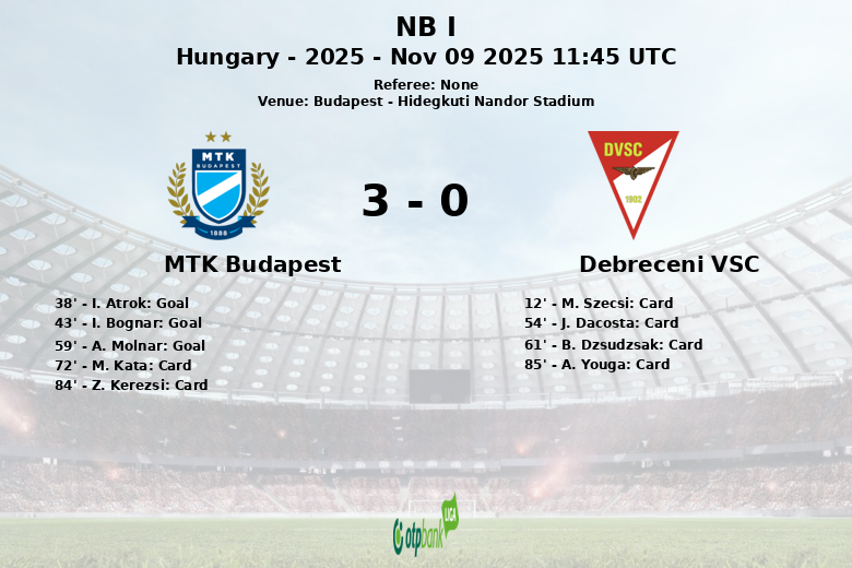 Budapest, Hungría – En un encuentro disputado en el Hidegkuti Nandor Stadium, el MTK Budapest se impuso con autoridad al Debreceni VSC en la jornada 13 de la NB I. El partido, jugado bajo la atenta mirada de los aficionados en Budapest, culminó con una victoria para el equipo local.