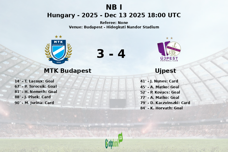 El MTK se vio favorecido inicialmente con un gol en propia puerta de T. Lacoux al minuto 14, pero el Újpest reaccionó con fuerza. A. Matko igualó el marcador justo antes del descanso, al minuto 45. La segunda mitad comenzó con otra jugada desafortunada para el MTK, un autogol de P. Kovacs al minuto 52 que daba la ventaja al Újpest. Sin embargo, el MTK no se rindió y P. Torocsik anotó al minuto 67, asistido por B. Varju, para igualar nuevamente el marcador.