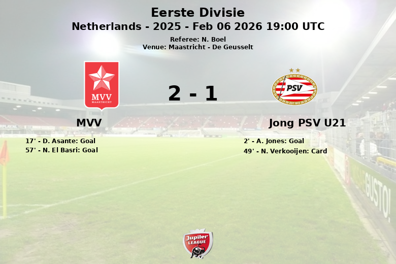 El Jong PSV U21 abrió el marcador temprano, al minuto 2, gracias a un gol de A. Jones asistido por E. Bassey. Sin embargo, el MVV respondió con un gol de D. Asante al minuto 17, con asistencia de S. Braken, igualando las acciones. El gol que le dio la victoria al MVV llegó al minuto 57, cortesía de N. El Basri, con asistencia de S. Van Dessel.