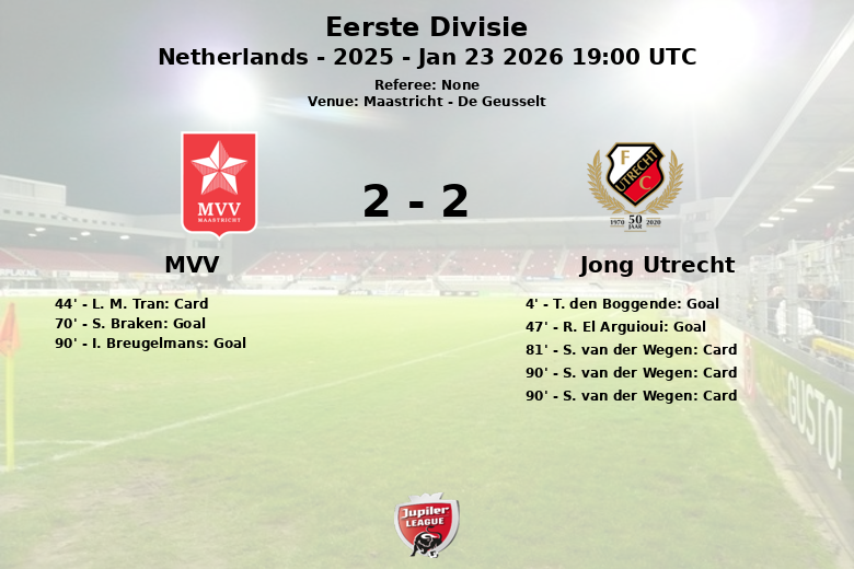 El MVV, con el apoyo de su afición y dominando la posesión con un 54%, luchó por regresar al partido. La perseverancia dio frutos al minuto 70, cuando S. Braken anotó de penal. La tensión creció en los minutos finales, culminando con la expulsión de S. van der Wegen del Jong Utrecht en el minuto 90. Instantes después, I. Breugelmans del MVV, con asistencia de I. Silva Timas, anotó un gol que aseguró el empate para los locales en el último suspiro.