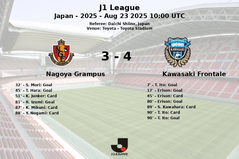 Toyota, Japón – En un partido vibrante y lleno de alternativas, Kawasaki Frontale se impuso a Nagoya Grampus en el Toyota Stadium el 23 de agosto de 2025. El encuentro, correspondiente a la jornada 27 de la J1 League, estuvo marcado por un alto ritmo de juego y numerosos goles.