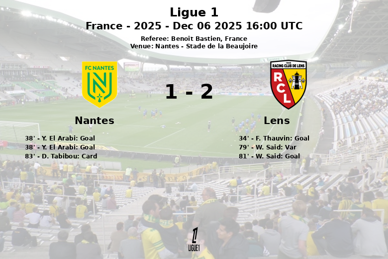 El Lens se adelantó en el minuto 34 gracias a un gol de F. Thauvin, quien aprovechó una excelente asistencia de R. Aguilar para batir al portero local. Sin embargo, la alegría visitante duró poco, ya que tan solo cuatro minutos después, Y. El Arabi empató para el Nantes. El delantero marroquí, tras fallar un penalti, aprovechó el rechace para marcar.
