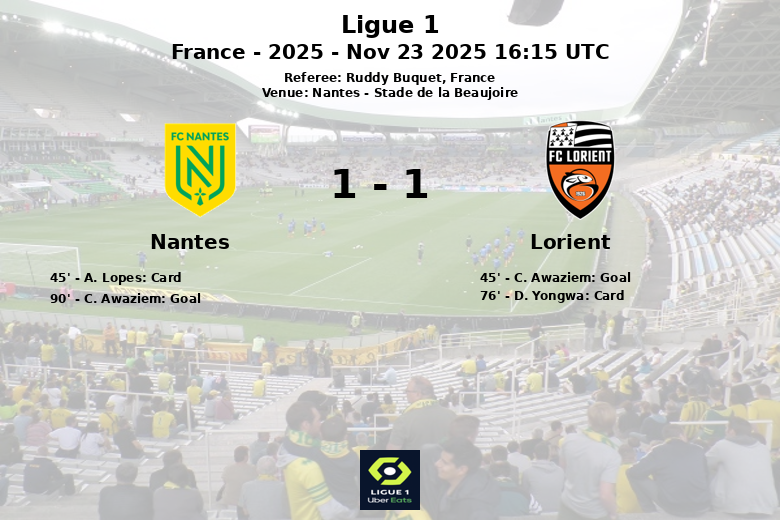 Cuando parecía que Lorient se llevaría la victoria, C. Awaziem, redimiéndose de su error anterior, anotó el gol del empate para el Nantes en el minuto 90, estableciendo un marcador final de 1 a 1. El partido, aunque con pocas ocasiones claras de gol (solo un tiro a puerta para cada equipo), dejó un sabor agridulce para ambos conjuntos, especialmente para Lorient, que vio esfumarse la victoria en los últimos instantes.