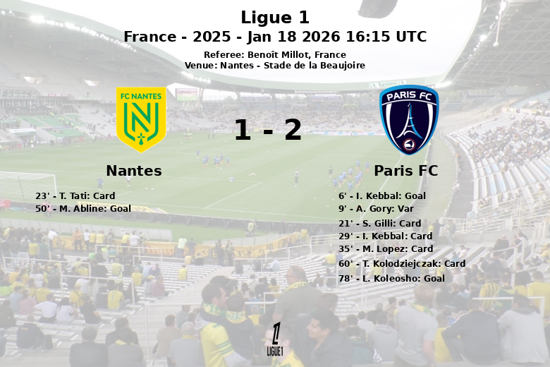 Nantes, Francia – En un encuentro disputado en el Stade de la Beaujoire, Nantes y Paris FC empataron en un partido que mantuvo a los aficionados al borde de sus asientos. El Paris FC tomó la delantera temprano con un gol de I. Kebbal al minuto 6, tras una buena jugada colectiva. Sin embargo, la alegría parisina fue efímera, ya que un gol de A. Gory fue anulado por el VAR al minuto 9 debido a una falta previa. El partido se tornó físico, con varias tarjetas amarillas mostradas a jugadores de ambos equipos.