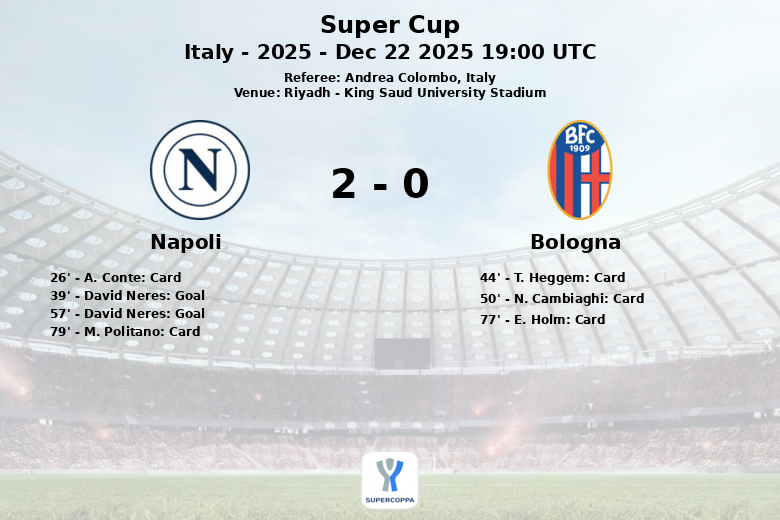 En un emocionante encuentro disputado en el King Saud University Stadium de Riyadh, Napoli se alzó con el título de la Supercopa italiana al vencer a Bologna. El partido, arbitrado por Andrea Colombo, se caracterizó por una alta intensidad y un juego disputado en el mediocampo.