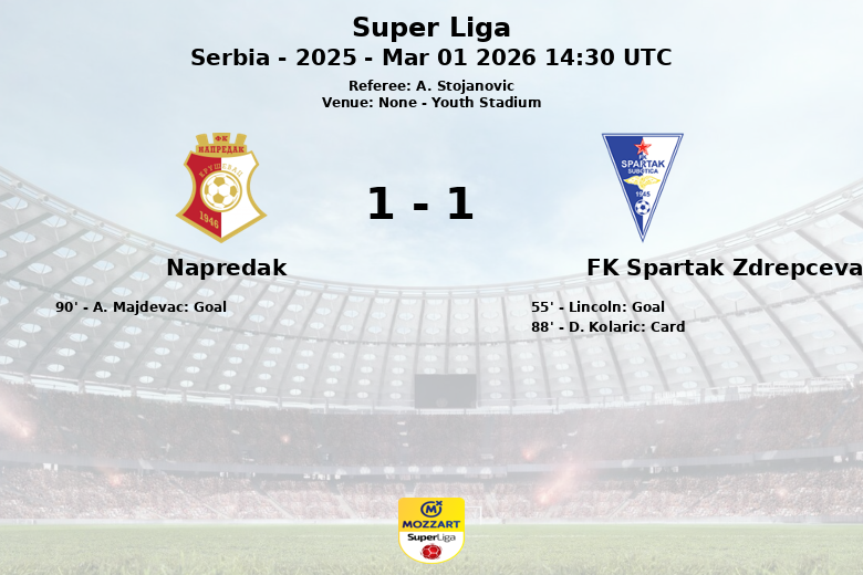 El FK Spartak Zdrepceva KRV se adelantó en el minuto 55 gracias a un gol de Lincoln, asistido por Ezequiel. Sin embargo, el Napredak, que había mantenido la posesión del balón, luchó por el empate hasta el último minuto. La perseverancia dio sus frutos cuando A. Majdevac anotó en el minuto 90, sellando el empate.