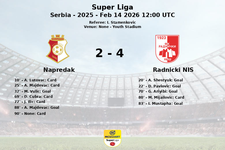 El Radnicki NIS logró una importante victoria en el Youth Stadium ante el Napredak, en un encuentro correspondiente a la jornada 23 de la Super Liga serbia. El partido, disputado el 14 de febrero de 2026, estuvo marcado por una alta intensidad y un constante ir y venir en el marcador.