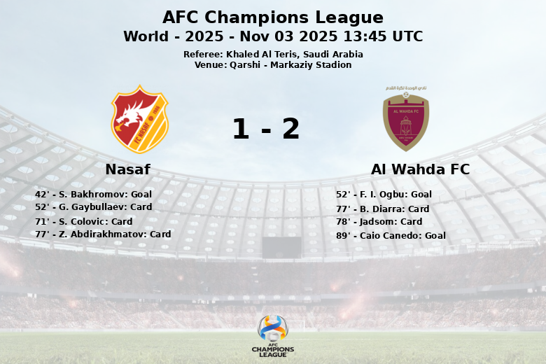 Qarshi, 3 de noviembre de 2025 – En un vibrante encuentro disputado en el Markaziy Stadion, Nasaf y Al Wahda FC empataron en un partido correspondiente a la fase de grupos de la AFC Champions League. El partido, arbitrado por Khaled Al Teris de Arabia Saudita, estuvo marcado por la intensidad y las oportunidades para ambos equipos.