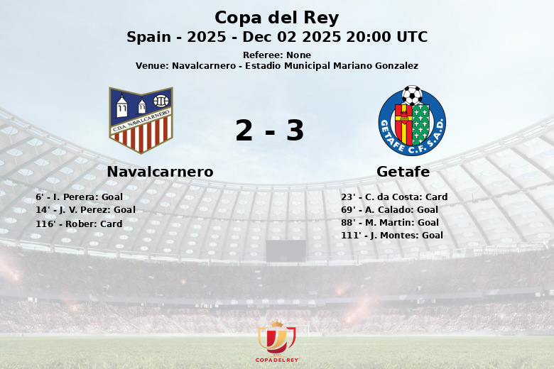 En el tiempo extra, el Getafe logró adelantarse con un gol de J. Montes al minuto 111, asistido por Alex Sancris. Pero el Navalcarnero supo aguantar el resultado. A pesar de la diferencia en posesión y tiros, el Navalcarnero supo aprovechar sus oportunidades y defender con garra su portería, dejando al Getafe fuera de la Copa del Rey. El partido finalizó con un Navalcarnero con más faltas cometidas (21) y más tiros a puerta (10) que su rival.