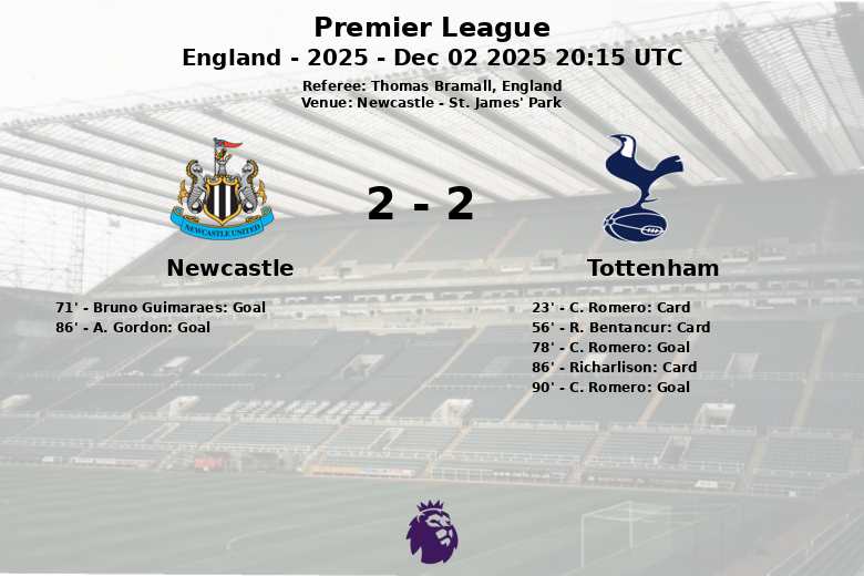 El marcador se abrió con un gol de Bruno Guimaraes al minuto 71, tras una asistencia de N. Woltemade, dando la ventaja a los locales. Tottenham respondió rápidamente, con C. Romero igualando el marcador al minuto 78 gracias a una asistencia de M. Kudus. La tensión se mantuvo hasta el final, con A. Gordon marcando de penal en el minuto 86 para adelantar nuevamente a Newcastle. Sin embargo, C. Romero volvió a aparecer en el minuto 90 para sellar el empate con su segundo gol del partido. El árbitro Thomas Bramall amonestó a C. Romero, R. Bentancur y Richarlison del Tottenham.