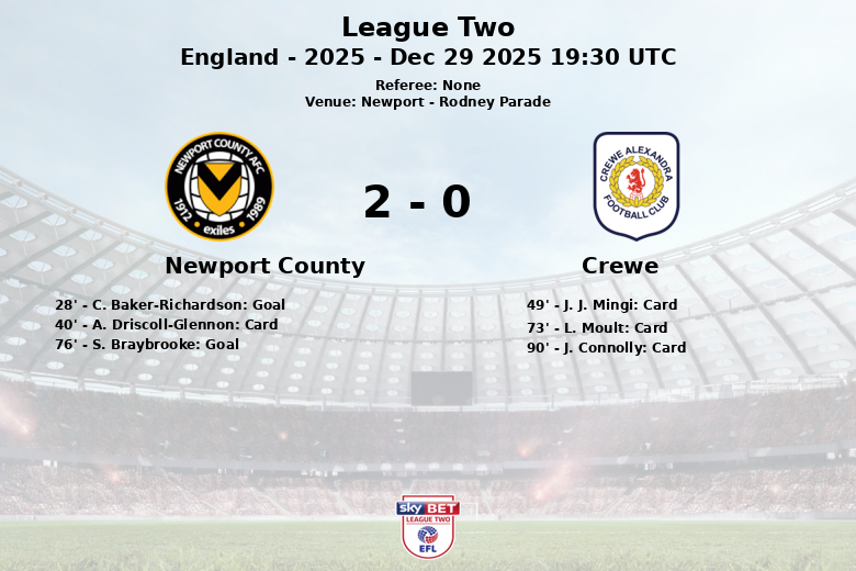 El primer gol llegó en el minuto 28, obra de C. Baker-Richardson, quien abrió el marcador sin asistencia. A pesar de una tarjeta amarilla para A. Driscoll-Glennon en el minuto 40, Newport mantuvo la compostura. Crewe, aunque dominó la posesión con un 59%, tuvo dificultades para concretar sus ataques. El equipo visitante recibió dos tarjetas amarillas, una para J. J. Mingi en el minuto 49 y otra para L. Moult en el minuto 73, además de otra tarjeta en el minuto 90 para J. Connolly.