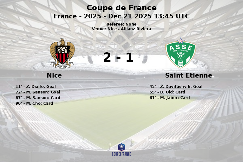 El Nice se adelantó temprano en el marcador, en el minuto 11, gracias a un gol de Z. Diallo tras una asistencia de J. Clauss. El Saint-Étienne respondió justo antes del descanso con un gol de penalti de Z. Davitashvili, igualando el partido.