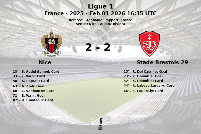 El partido se caracterizó por un alto número de faltas y tarjetas amarillas, reflejo de la intensidad en el juego. Nice logró reaccionar en la segunda mitad, con un gol de A. Abdi en el minuto 63 y otro de E. Wahi en el minuto 71, empatando el marcador 2-2. A pesar del dominio en la posesión por parte de Nice (60%), Stade Brestois 29 demostró ser un rival peligroso en el contraataque. El encuentro finalizó con un empate que dejó a ambos equipos con un punto.