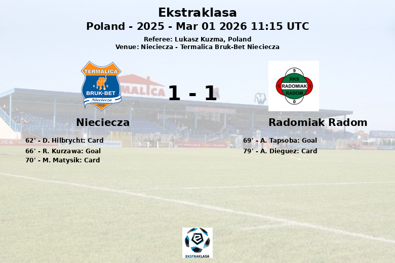 Radomiak Radom dominó la posesión del balón con un 63%, intentando imponer su juego. Sin embargo, fue Nieciecza quien se adelantó en el marcador gracias a un gol de R. Kurzawa en el minuto 66, con una asistencia de I. Durdov. La alegría local no duró mucho, ya que A. Tapsoba empató para el Radomiak Radom en el minuto 69, asistido por Zie Ouattara.