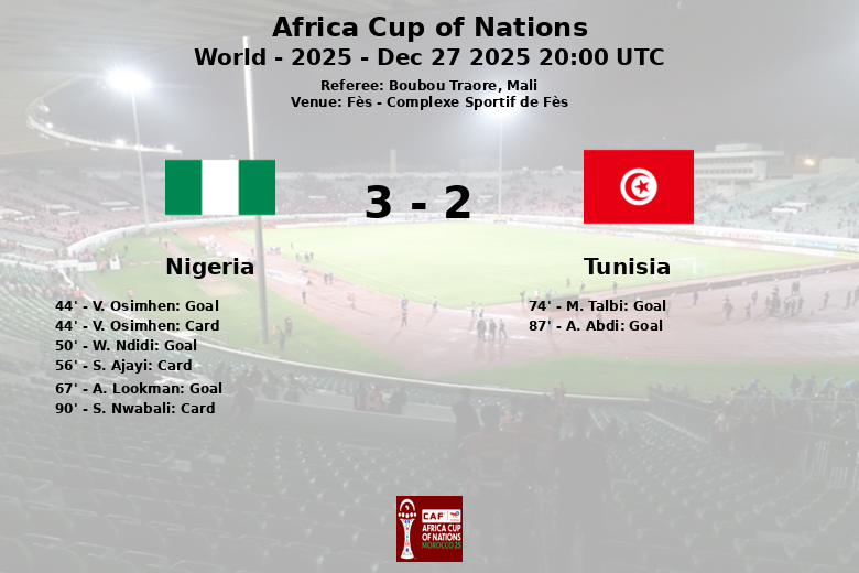 Túnez no se rindió y M. Talbi descontó en el minuto 74, asistido por H. Mejbri. En los minutos finales, A. Abdi marcó un gol de penal para Túnez en el minuto 87, acortando distancias. El partido terminó con una victoria de Nigeria. El árbitro Boubou Traore, de Mali, mostró dos tarjetas amarillas al equipo nigeriano (V. Osimhen y S. Nwabali). Nigeria cometió 18 faltas, mientras que Túnez hizo 15. Los corners fueron favorables a Túnez con 6 contra 4 de Nigeria.