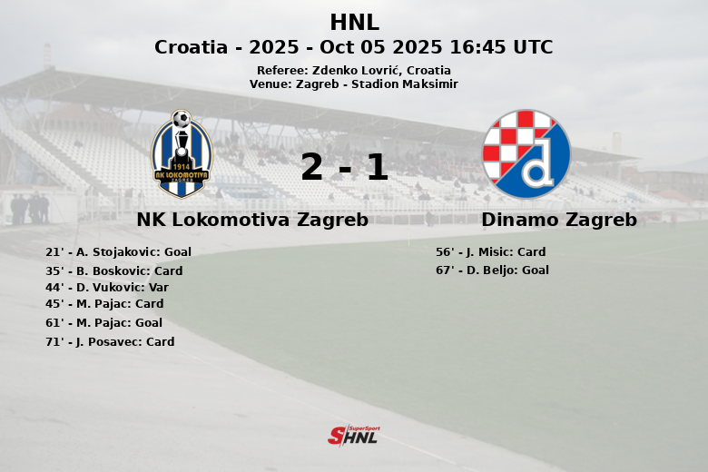 Zagreb, Croacia – En un encuentro disputado en el Stadion Maksimir, el NK Lokomotiva Zagreb y el Dinamo Zagreb firmaron un empate que dejó a los aficionados al borde de sus asientos. El Lokomotiva, con un 37% de posesión, sorprendió al tomar la delantera en el minuto 21 con un gol de A. Stojakovic, asistido por F. Krivak. Sin embargo, el partido estuvo marcado por la intensidad y las faltas, sumando 19 el Lokomotiva y 16 el Dinamo, lo que resultó en varias tarjetas amarillas. Un gol de D. Vukovic para el Lokomotiva fue anulado por el VAR en el minuto 44 debido a una falta previa. Ya en el segundo tiempo, M. Pajac amplió la ventaja para el Lokomotiva con un penal en el minuto 61. El Dinamo, con un 63% de posesión y 16 disparos, no se rindió y logró igualar el marcador gracias a un gol de D. Beljo en el minuto 67, asistido por M. Bakrar. A pesar del dominio del Dinamo y sus 11 tiros de esquina, el Lokomotiva resistió, finalizando el partido con un empate que refleja la lucha y la determinación de ambos equipos. El árbitro, Zdenko Lovrić, tuvo una tarde ocupada señalando numerosas faltas y amonestando a varios jugadores.