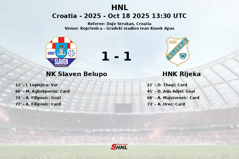 Koprivnica fue testigo de un encuentro vibrante entre el NK Slaven Belupo y el HNK Rijeka, que terminó con un marcador de uno a uno. El partido, correspondiente a la décima jornada de la HNL en el Gradski stadion Ivan Kusek Apas, estuvo marcado por la intensidad y la disputa constante en el mediocampo.