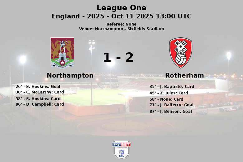 El Northampton, a pesar de tener menos tiros (3 contra 11 del Rotherham), intentó reaccionar, pero la defensa del Rotherham se mantuvo firme. El encuentro finalizó con un total de cinco tarjetas amarillas para el Northampton y dos para el Rotherham, reflejo de la intensidad del juego. Los tiros a puerta fueron 1 para el Northampton y 2 para el Rotherham.