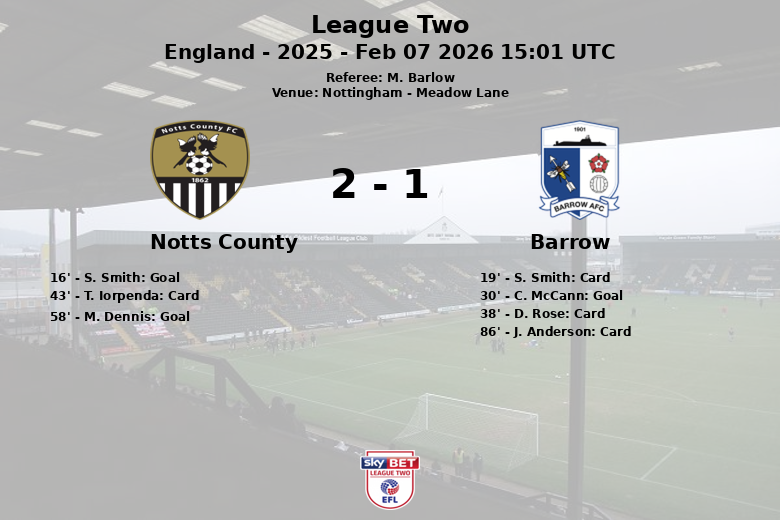 El encuentro comenzó con un desafortunado autogol de S. Smith al minuto 16, poniendo en ventaja al Notts County. Sin embargo, Barrow respondió rápidamente, con C. McCann anotando al minuto 30, tras una asistencia de J. Earing, para igualar el marcador.