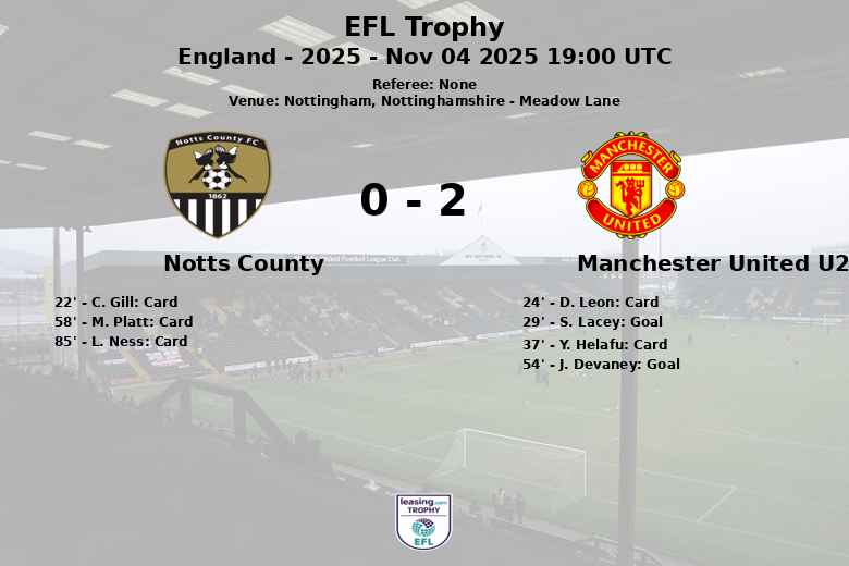 Nottingham, Nottinghamshire – En un encuentro disputado en Meadow Lane, el Manchester United U21 se impuso al Notts County con un marcador de 2 a 0 en la jornada Northern – 3 del EFL Trophy. A pesar de que el Notts County dominó la posesión con un 51% frente al 49% del Manchester United U21, el equipo visitante demostró mayor efectividad de cara al gol.