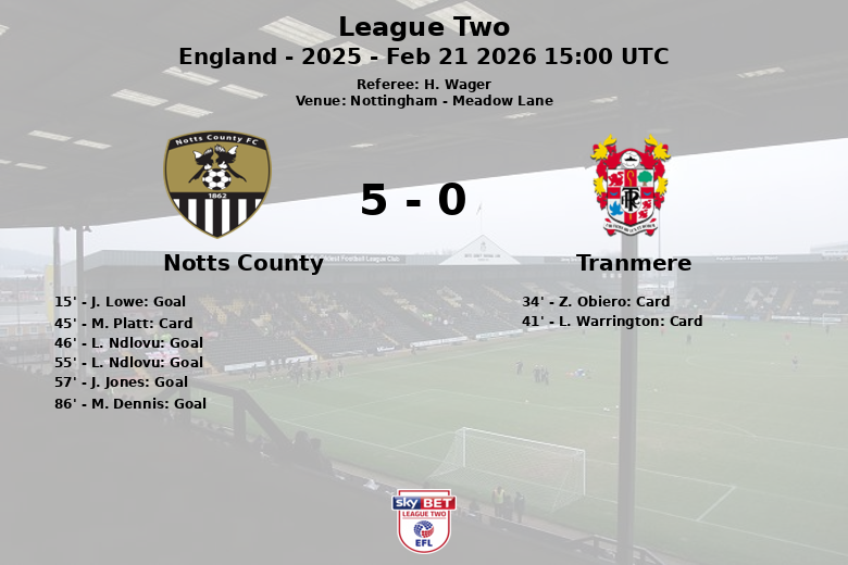 El partido comenzó con un gol en propia puerta de J. Lowe en el minuto 15, dando ventaja temprana al Notts County. El Tranmere intentó reaccionar, pero se encontró con una defensa sólida y vio a Z. Obiero y L. Warrington amonestados. Antes del descanso, M. Platt del Notts County también recibió una tarjeta amarilla.