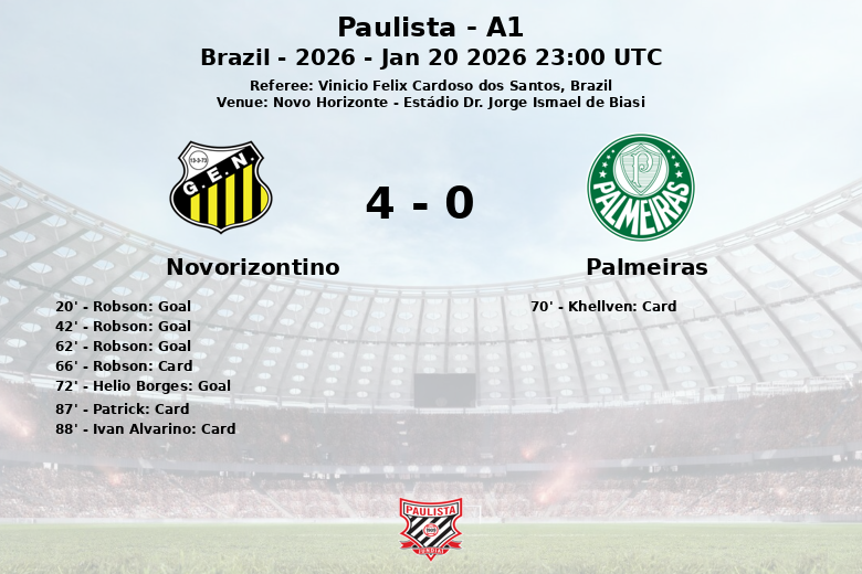 Novo Horizonte, Brasil – En un encuentro que desafió las expectativas, el Novorizontino se impuso contundentemente al Palmeiras en el Estádio Dr. Jorge Ismael de Biasi. El partido, correspondiente a la cuarta ronda de la temporada regular de la Paulista A1, finalizó con un marcador abultado a favor del equipo local.