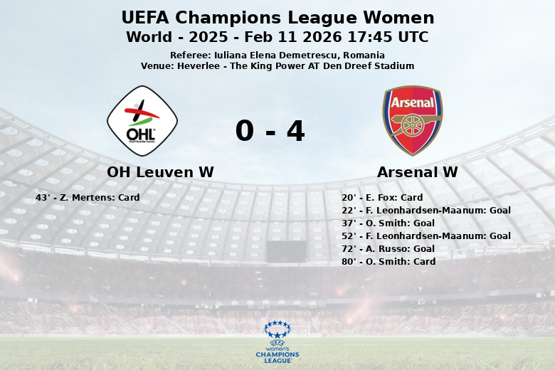 El OH Leuven W, por su parte, luchó por contener el ataque del Arsenal, pero solo pudo generar 5 tiros, de los cuales solo uno fue a puerta. Su posesión se limitó al 29% y sufrieron para crear oportunidades de gol. El partido también estuvo marcado por algunas tarjetas amarillas, dos para el Arsenal W (E. Fox en el minuto 20 y O. Smith en el minuto 80) y una para el OH Leuven W (Z. Mertens en el minuto 43).