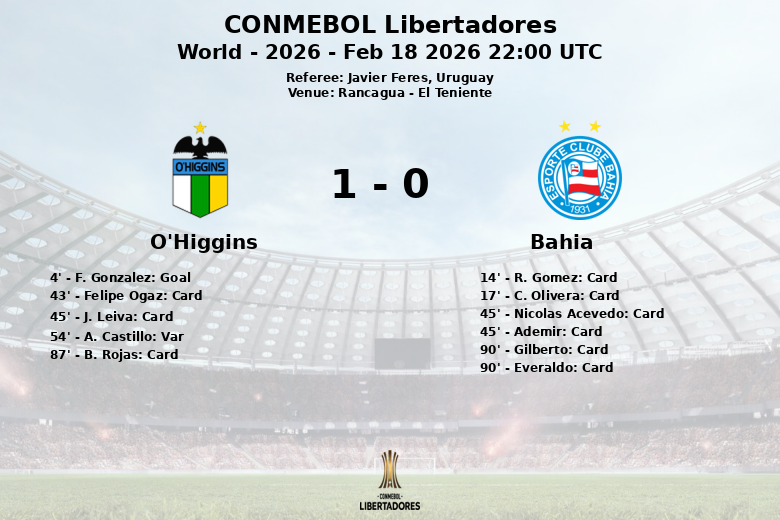 El árbitro uruguayo Javier Feres tuvo una ardua labor en un partido donde las faltas fueron constantes. O’Higgins cometió un total de 18 faltas, mientras que Bahia incurrió en 8. Finalmente, O’Higgins se llevó la victoria en casa, un resultado crucial en su camino en la CONMEBOL Libertadores.
