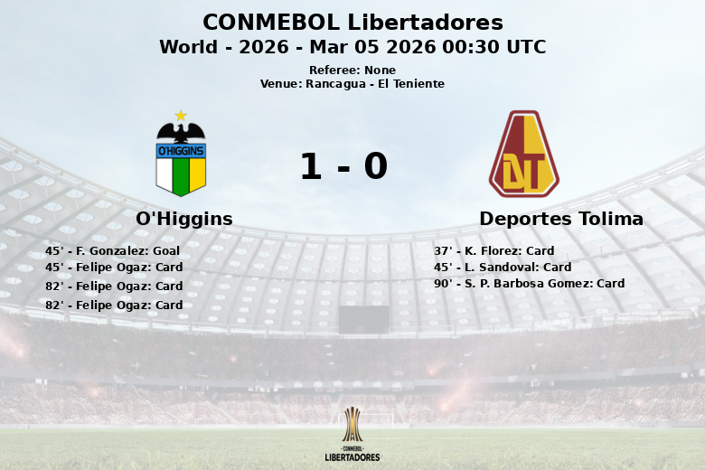 Rancagua, Chile – En un encuentro disputado en el Estadio El Teniente, O’Higgins logró una victoria sobre Deportes Tolima en la final de la CONMEBOL Libertadores. El partido, que tuvo lugar el 5 de marzo de 2026, se caracterizó por una alta tensión y varias incidencias disciplinarias.