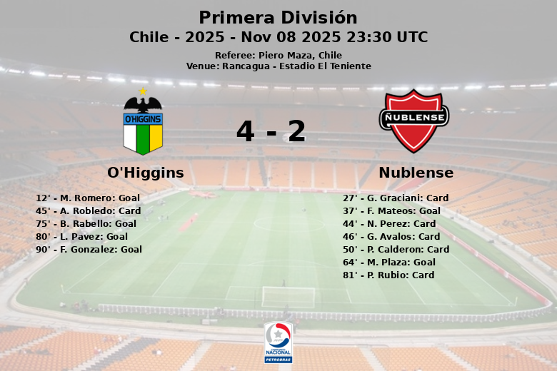 Rancagua, Chile – En un encuentro disputado en el Estadio El Teniente, O’Higgins logró una importante victoria sobre Ñublense con un marcador final de 4 a 2, en un partido correspondiente a la jornada 27 de la Primera División chilena.