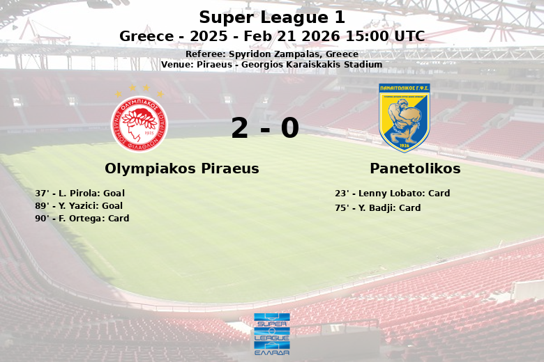 El primer gol del encuentro llegó en el minuto 37, gracias a L. Pirola, quien aprovechó una asistencia de Chiquinho para adelantar a Olympiakos. Panetolikos, a pesar de sus esfuerzos, solo pudo generar 5 tiros durante todo el partido, con una única ocasión que puso a prueba al portero rival.