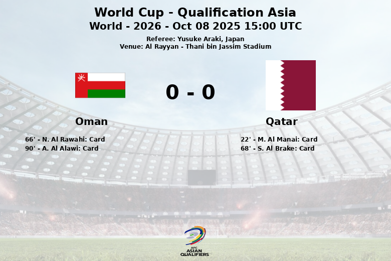 El encuentro también se vio marcado por la disciplina. M. Al Manai y S. Al Brake recibieron tarjetas amarillas por parte de Qatar, mientras que N. Al Rawahi y A. Al Alawi fueron amonestados por Omán. El partido, correspondiente a la Ronda 4, dejó la sensación de que Qatar deberá mejorar su puntería si quiere asegurar su pase al Mundial.