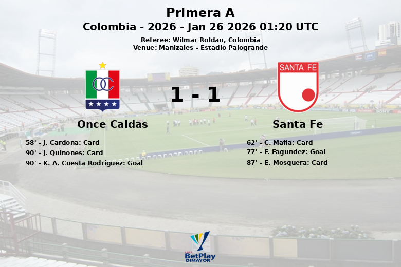 Cuando parecía que Santa Fe se llevaría la victoria, Once Caldas, impulsado por su afición, no se rindió y encontró el empate en el minuto 90, gracias a un gol de K. A. Cuesta Rodriguez, asistido por P. Gomez. Este gol igualó el marcador y selló un empate que, si bien no dejó satisfecho a ninguno de los dos equipos, reflejó la paridad en el esfuerzo y la lucha mostrada en el campo de juego. El árbitro Wilmar Roldan también mostró tarjetas amarillas a los jugadores de Once Caldas en el minuto 90 y a Santa Fe en el minuto 87. El partido concluyó con Once Caldas dominando la posesión del balón, pero Santa Fe mostrando efectividad en sus oportunidades de gol.