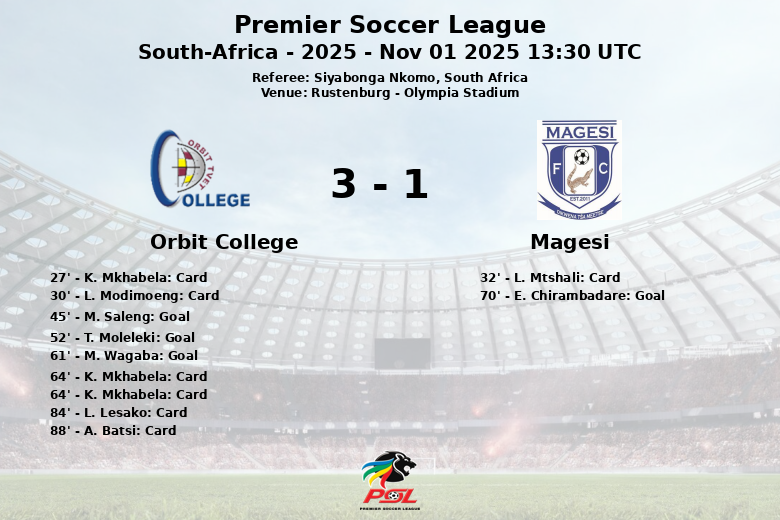 Rustenburg, Sudáfrica – En un encuentro disputado en el Olympia Stadium, Orbit College logró una importante victoria sobre Magesi en un partido correspondiente a la jornada 11 de la Premier Soccer League. El partido, arbitrado por Siyabonga Nkomo, estuvo marcado por un alto número de tarjetas y momentos de tensión.