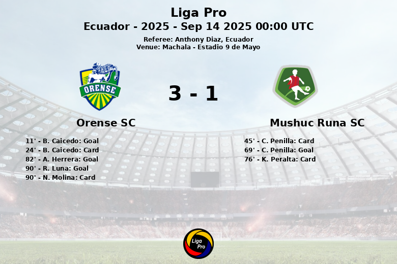 En el tiempo de descuento, R. Luna selló la victoria para Orense con un gol al minuto 90, tras una brillante jugada de A. Herrera. El partido tuvo un ritmo intenso, reflejado en las 14 faltas cometidas por cada equipo y las tarjetas amarillas mostradas a B. Caicedo y N. Molina por Orense, y a C. Penilla y K. Peralta por Mushuc Runa.